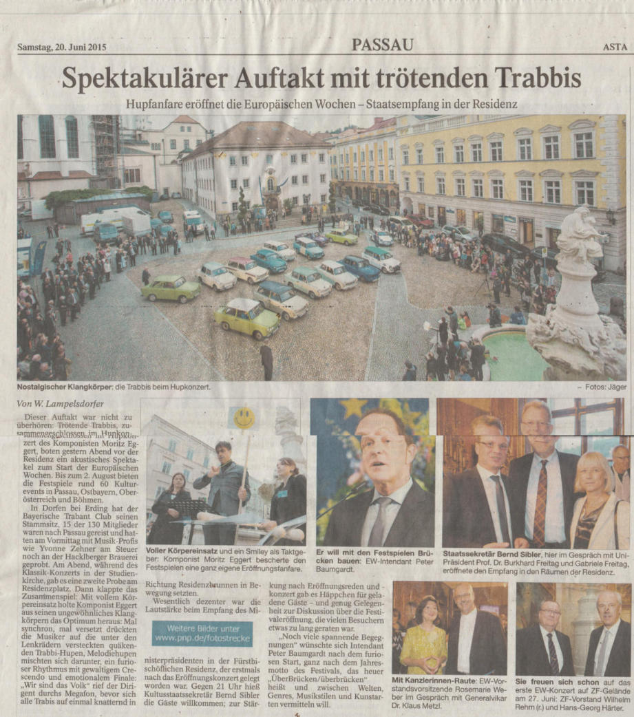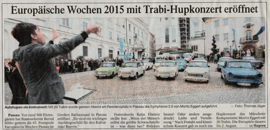 Passauer neue Presse vom 20.06.2015: Anläßlich der Europäischen Wochen wurden einige Trabis aus unserem bayrischen Trabnt Club e.V. von der Stadt Passau eingeladen, um den geladenen Gästen ein Konzert der Superlative zu bieten. Extra für uns komponierte der Stardirigent Moritz Eggert eine Symphonie, in der wir mit einem Hupkonzert die Geschichte des Mauerfalls nachspielten!